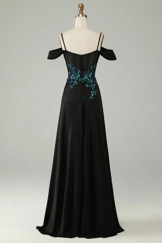 Beaira Cold Shoulder Black Sequins Corset Long Prom Dress