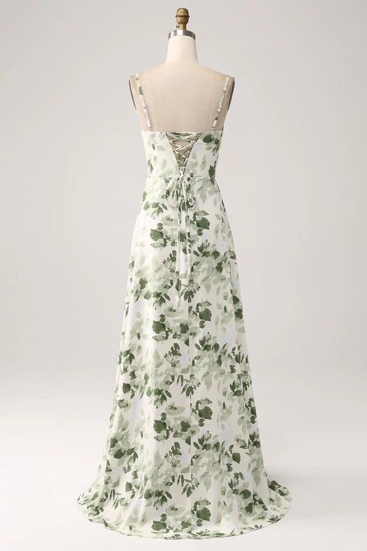 Beaira Cowl Neck Green Floral A Line Prom Dress with Slit