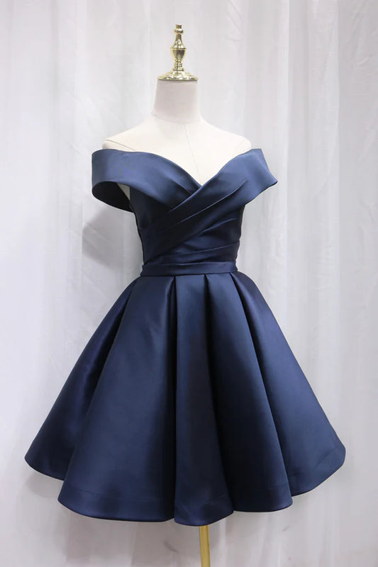Simple Satin Short Prom Dress Off Shoulder Blue Party Dress