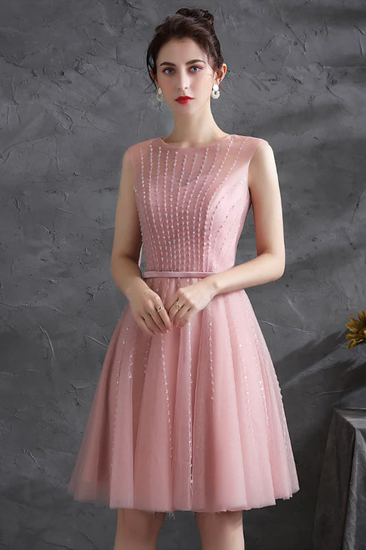 Pink Scoop Tulle Short Prom Dress with Beaded Pink Knee Length Party Dress