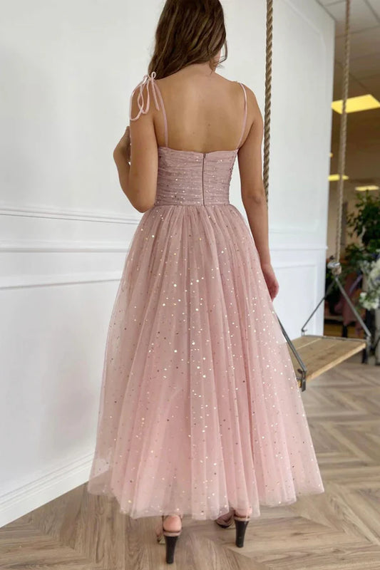 Spaghetti Straps Tulle Short Prom Dress Pink A-Line Evening Party Dress