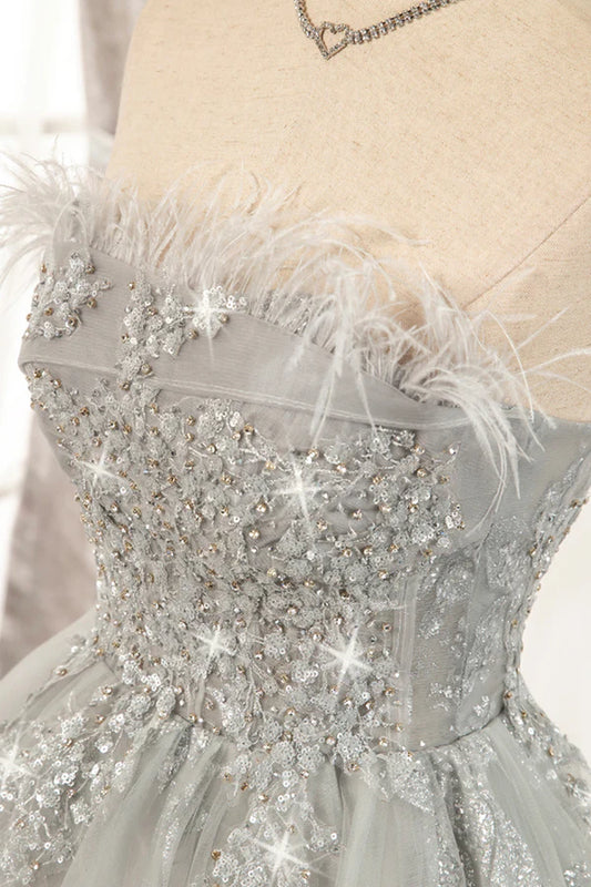 Gray Strapless Tulle Short Prom Dress with Sequins Cute A-Line Party Dress