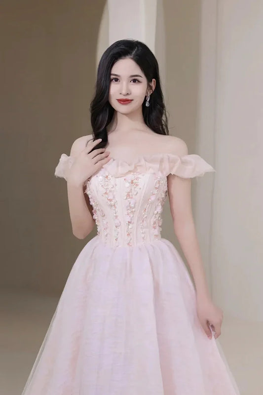 Pink Tulle Beaded Short Prom Dress Pink Off Shoulder Evening Party Dress