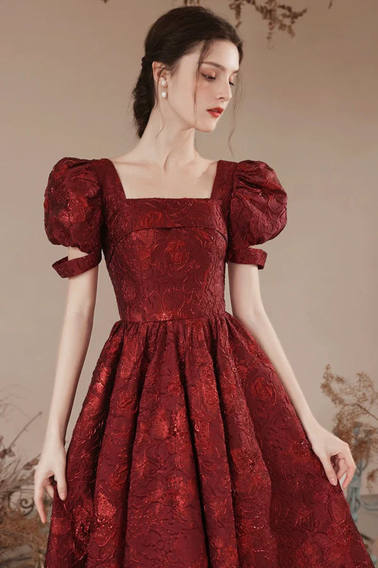 Burgundy Short Sleeve Tea Length Prom Dress Lovely A-Line Evening Party Dress