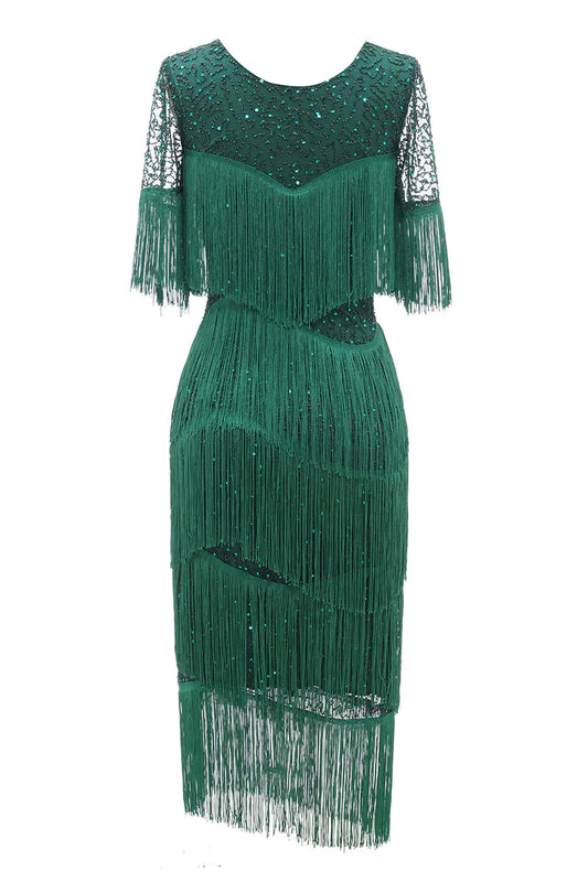 Dark Green Short Sleeves 1920s Dress With Fringes