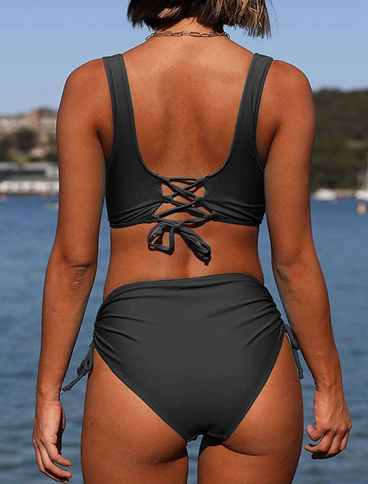 Women's Normal Swimwear Bikini 2 Piece Swimsuit Pleated 2 Piece High Waist Open Back Sexy Pure Color V Wire Vacation Stylish Bathing Suits