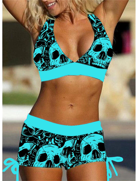 Women's Swimwear Bikini 2 Piece Plus Size Swimsuit Open Back Printing Leopard Skull White Blue Purple Red V Wire Bathing Suits New Vacation Holiday / Modern / Letter / Flower / Padded Bras