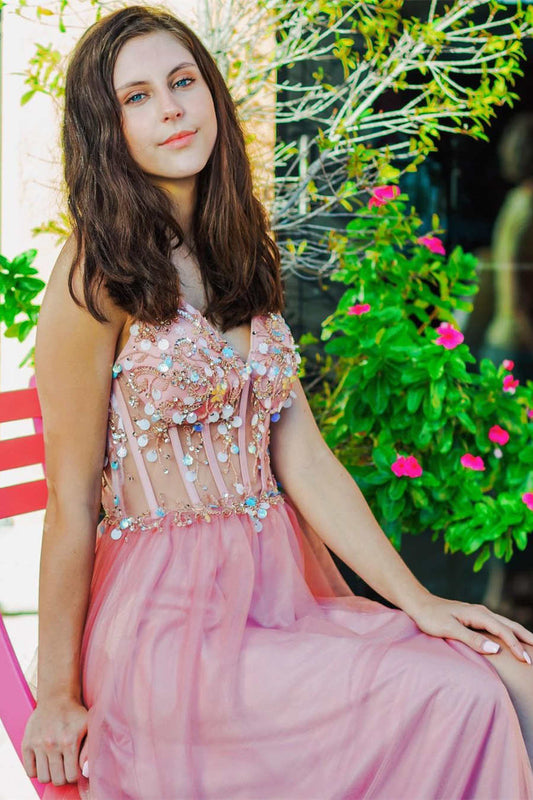 A Line Spaghetti Straps Deep V Neck Beads Tulle Prom Dresses with High Split