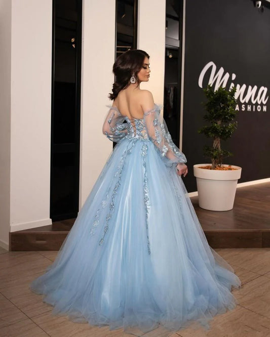 A line Light Blue Tulle Prom Dresses with Appliques Sweetheart Evening Dress
