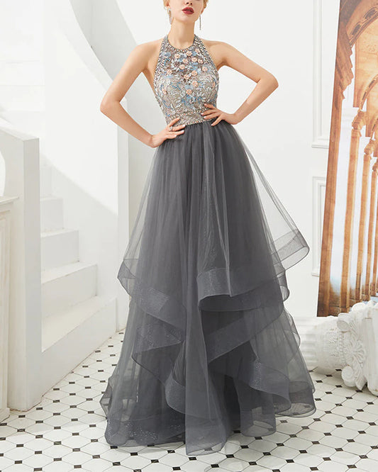 A-Line Tulle Halter Open Back Long Prom Dresses Sleeveless Evening Dresses