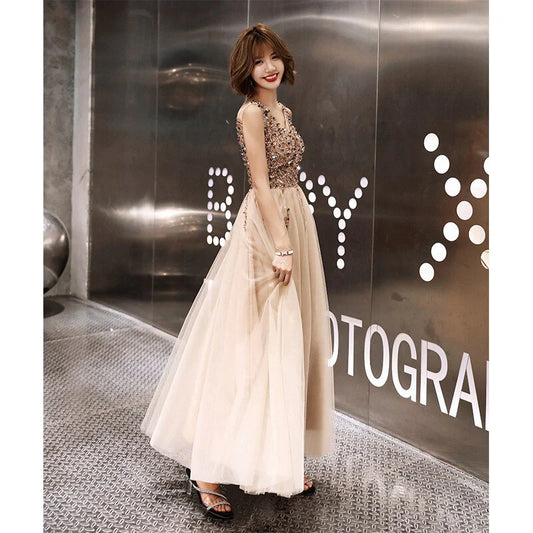 V Neck Sleeveless Tulle Long Prom Dress With Beads Crystal