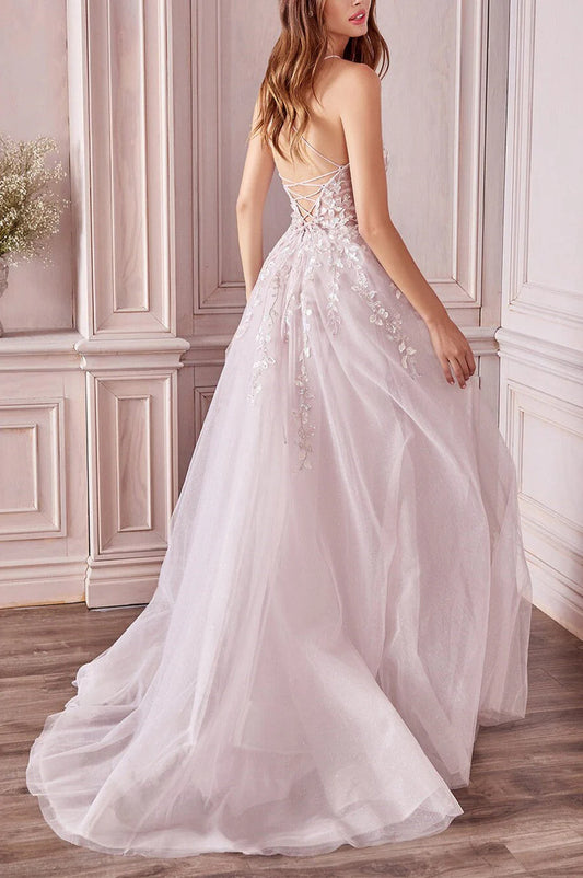 A-Line/Princess Sleeveless V-Neck Floor-Length Applique Tulle Prom Dresses