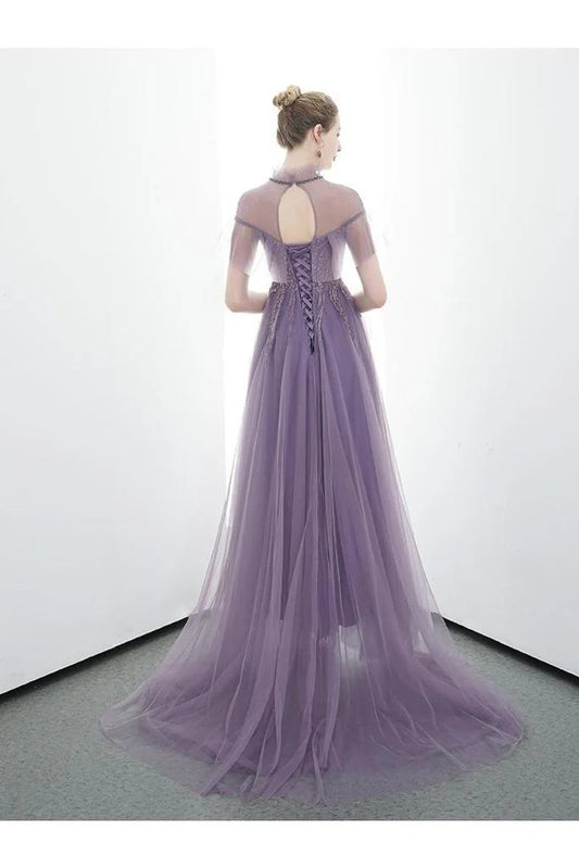 A-Line Tulle Long High Neck Prom Dresses With Ruffles Formal Evening Dress