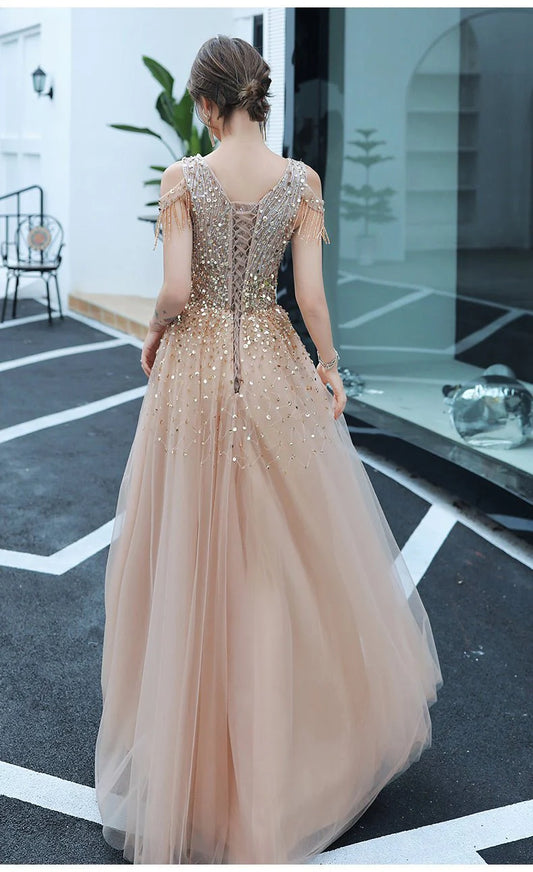 V Neck Sleeveless Beading Tulle Prom Dresses Quinceanera Dress
