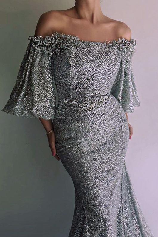 Off The Shoulder Mermaid Sequins With Sleeves Sweep Train Prom Dresses