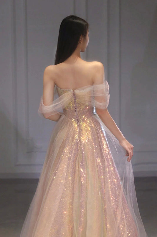 A Line Off the Shoulder Champagne Sequins Long Prom Dress