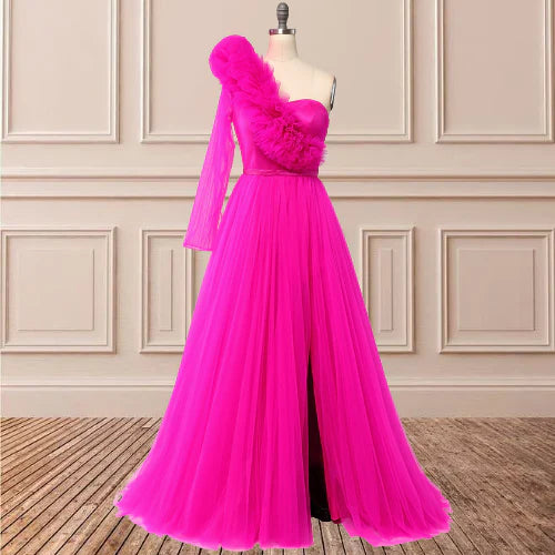 Mermaid Tulle One Shoulder Long Sleeves Slit Prom Dresses