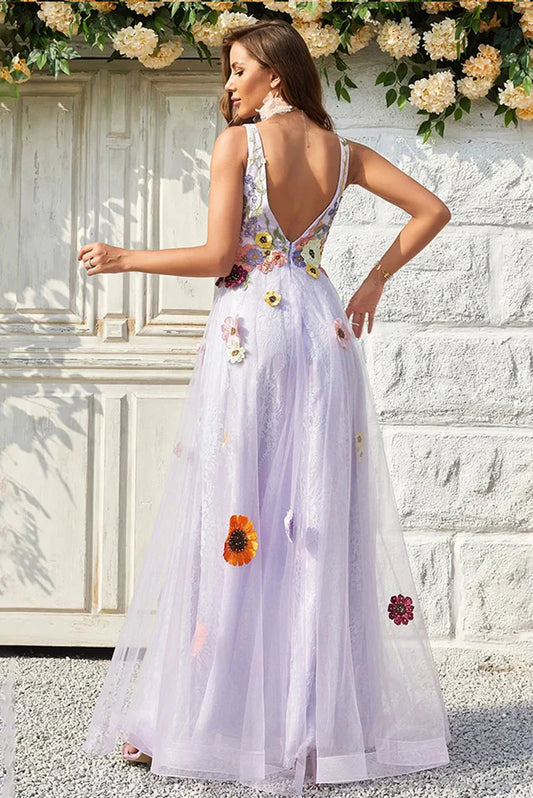 V-Neck Sleeveless Floor-Length Flower Tulle Prom Dresses