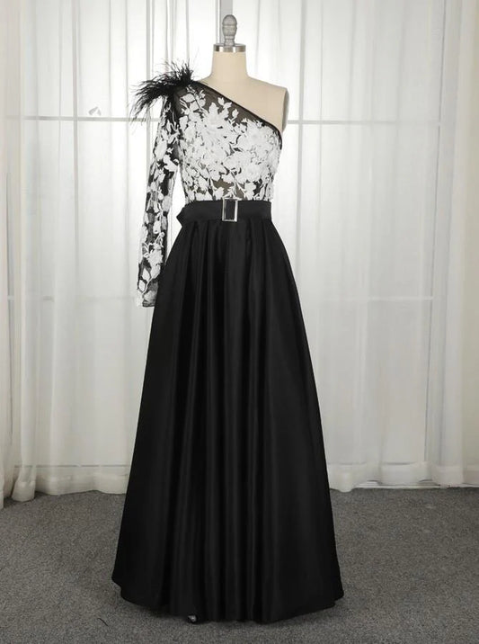 A Line Satin One Shoulder Long Sleeves Split Pockets Prom Dresses With Applique Floor Length