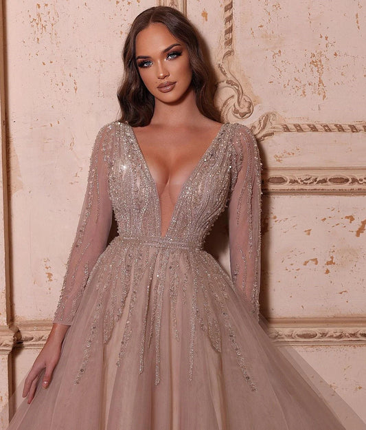 A-Line V-Neck Long Sleeves Tulle Crystal Sequined Beading Prom Dresses