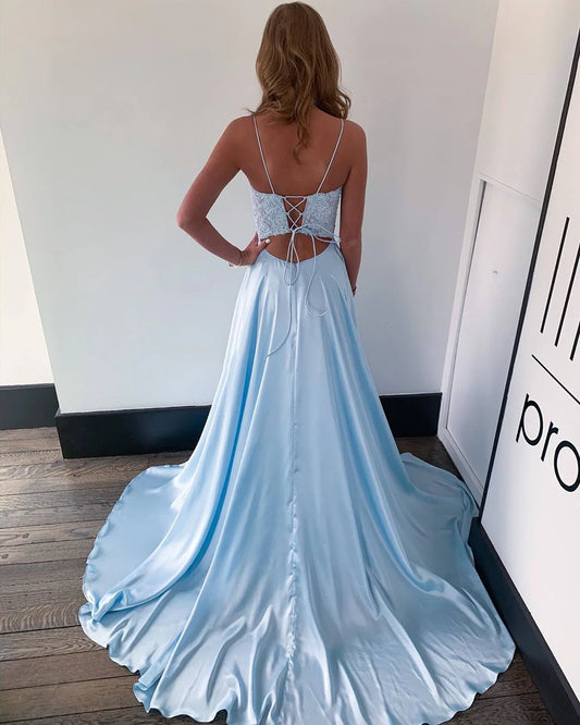 V Neck With Applique Blue Open Back Prom Dresses A Line