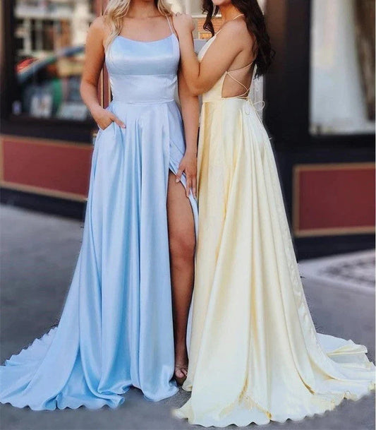 A Line Side Slit Satin Light Yellow Long Prom Dresses