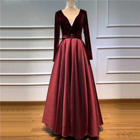 A line Long Sleeve Burgundy Prom Dresses Satin Deep V Neck High Slit Evening Dress