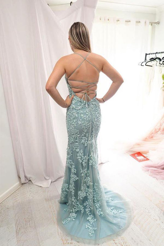 Mermaid Spaghetti Straps Long Lace Prom Dresses