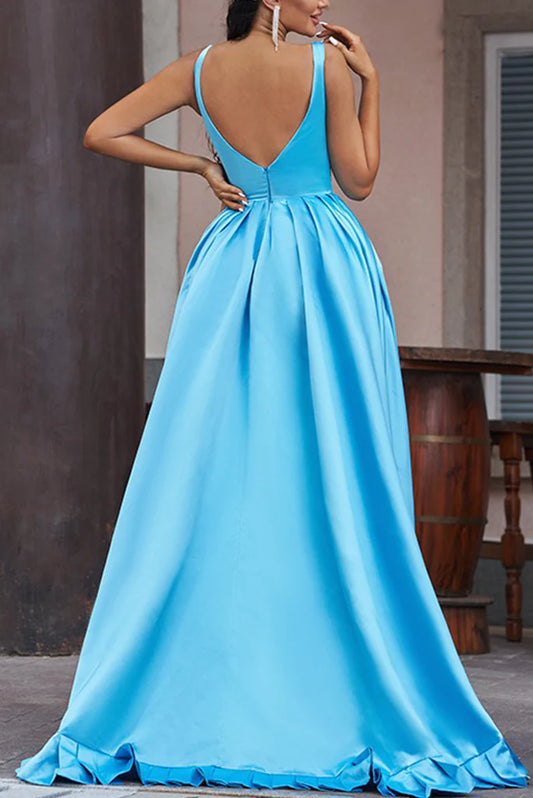 V Neck Spaghetti Straps Satin Prom Dresses