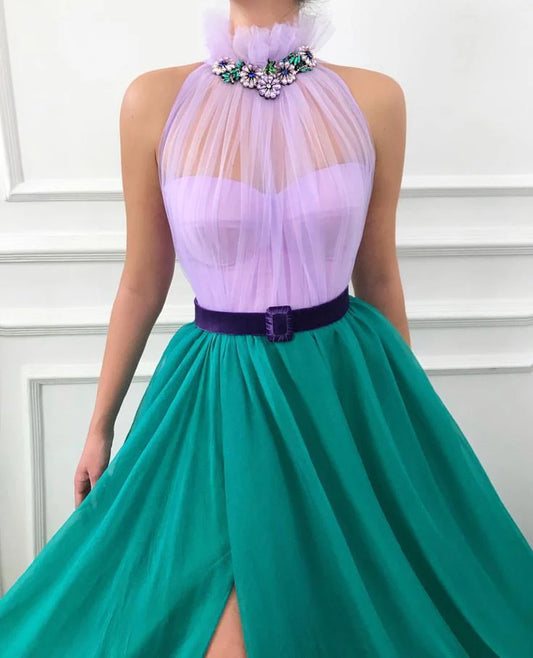 A Line Chiffon Open Back Halter Slit Tulle Long Cheap Prom Dresses