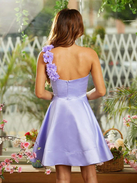 Homecoming Dresses Ball Gown One-Shoulder Knee-Length Satin With Handmade Flowers