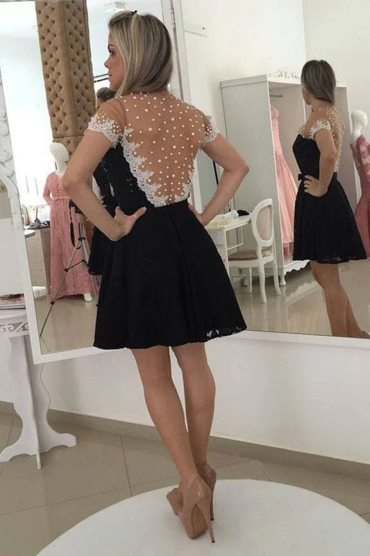 Black Lace Cute Scoop Cap Sleeve Open Back A-Line Homecoming Dresses UK