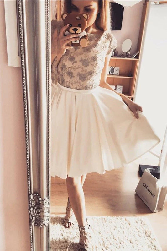 A Line Scoop Short Sleeves Lace With Applique And Beads Homecoming Dresses