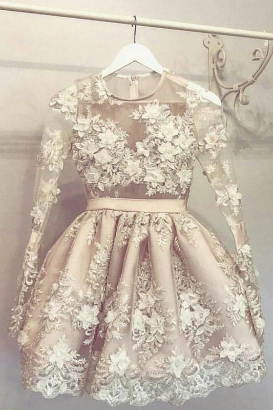 Scoop Homecoming Dresses Long Sleeves A Line With Applique Short/Mini Tulle Skirt