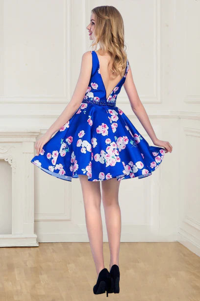 A Line V-Neck Short/Mini Satin Floral Homecoming Dresses