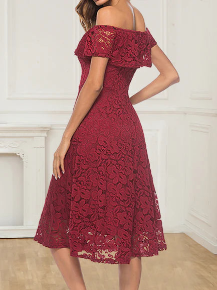 A-line Short Sleeve Burgundy Off-the-Shoulder Lace Knee-Length Grace Homecoming Dresses