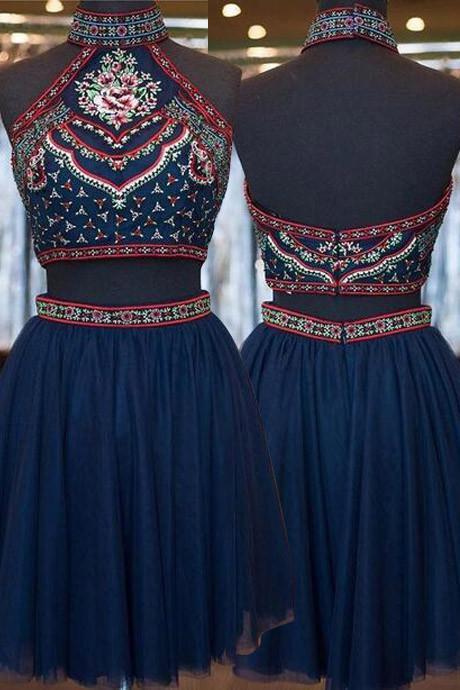 Fashion Halter A-line Two Piece Short Homecoming Dress