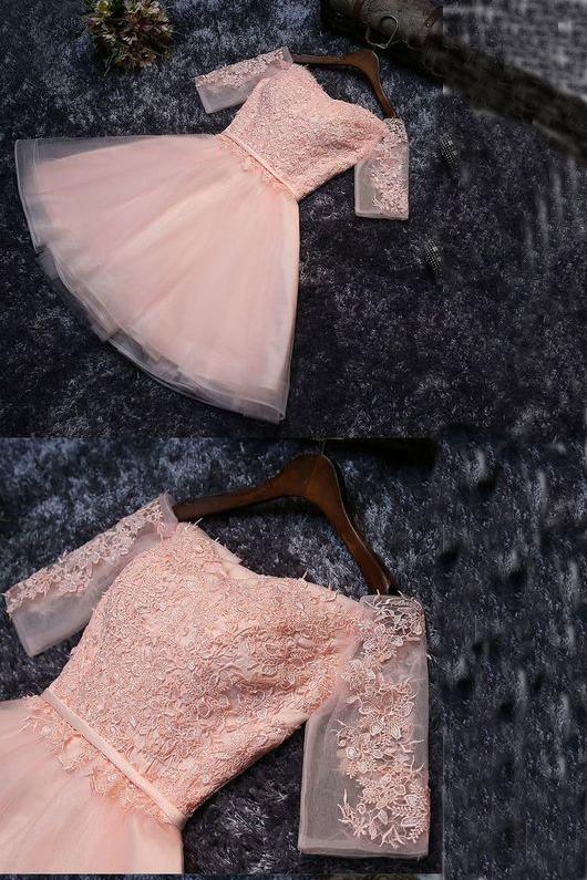 Cute Lace Tulle A-line Off the Should Half Sleeves Short Homecoming Dresses