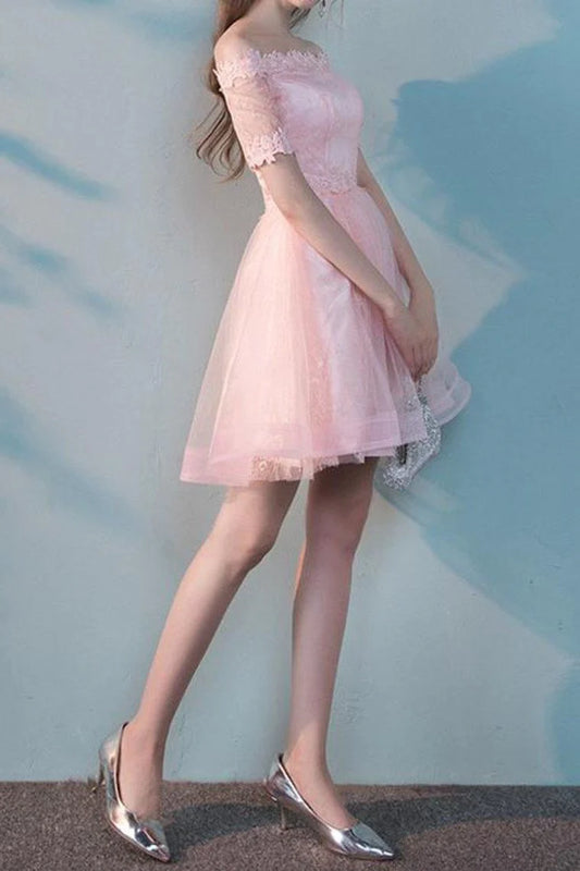 Off Shoulder Short Sleeves Mini Blush Lace Homecoming Dress with Appliques