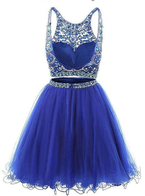 Jewel Neck Illusion Sequins Crystal Shining Two Piece Low Back Royal Blue Tulle Homecoming Dress
