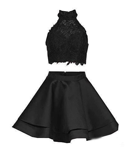 Halter 2 Piece Pink Satin Homecoming Dresses with Lace Mini Short Cocktail Dresses