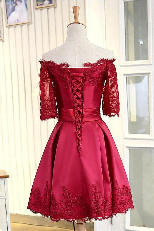 A Line Short Sleeves Satin Lace Appliques Lace up Scoop Short Cocktail Dress Homecoming Dresses