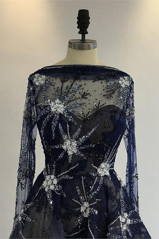 A Line Navy Blue Long Sleeve Beads Open Back Tulle Short Cocktail Dress Homecoming Dress