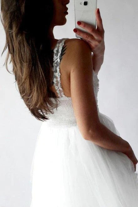A-Line V-Neck Short Cocktail Dress White Tulle Lace Beads Homecoming Dress with Appliques