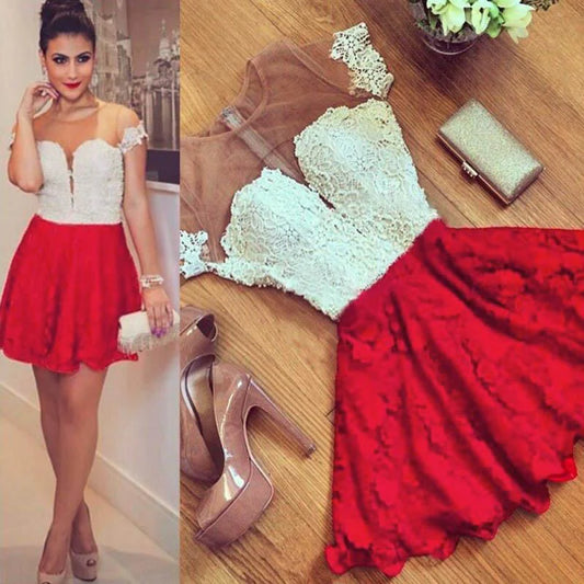 Cute Red Lace Short Sleeve Knee Length Homecoming Dress Cheap Cocktail Dresses