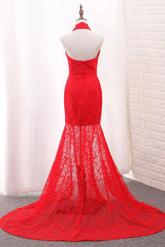 Mermaid High Neck Party Dresses Lace With Slit Sweep Train