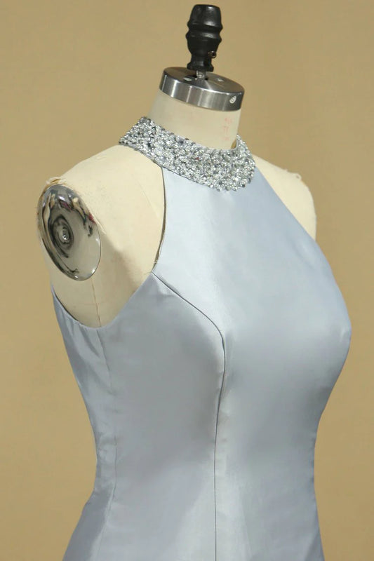 Sheath Party Dresses Halter With Beads Satin Sweep/Brush Train