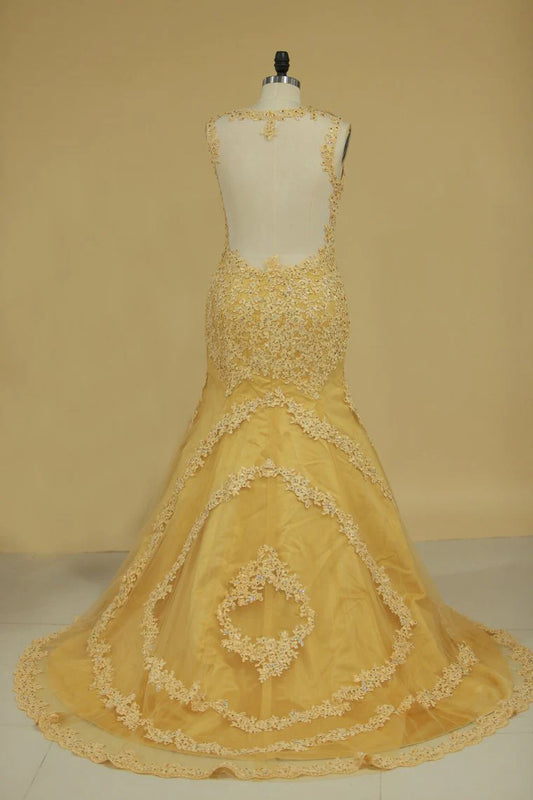 Mermaid Party Dresses Scoop Sweep Train Tulle With Gold Applique
