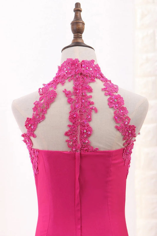 Satin Mermaid High Neck Party Dresses With Applique Sweep Train