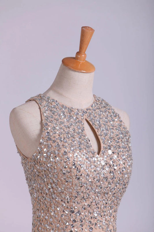 New High Neck Sheath Party Dresses Spandex With Beading & Slit